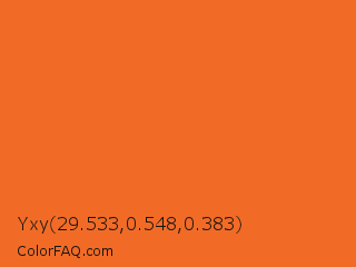 Yxy 29.533,0.548,0.383 Color is a normal orange color and the nearest color is Vivid Tangelo #f07427. Hex code #f26b26 and RGB value is rgb(242,107,38). In RGB color space, this color is composed of 95% red, 42% green, 15% blue, In CMYK color space, this color is composed of 0% cyan, 56% magenta, 84% yellow , 5% black , In HSL color space, this color has a hue angle of 20° , 89% saturation and 55% lightness.