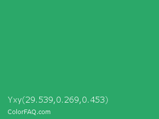 Yxy 29.539,0.269,0.453 Color is a normal green color and the nearest color is Green Crayola #1cac78. Hex code #2ba869 and RGB value is rgb(43,168,105). In RGB color space, this color is composed of 17% red, 66% green, 41% blue, In CMYK color space, this color is composed of 74% cyan, 0% magenta, 38% yellow , 34% black , In HSL color space, this color has a hue angle of 150° , 59% saturation and 41% lightness.