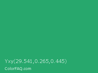 Yxy 29.541,0.265,0.445 Color is a normal green color and the nearest color is Green Crayola #1cac78. Hex code #27a86d and RGB value is rgb(39,168,109). In RGB color space, this color is composed of 15% red, 66% green, 43% blue, In CMYK color space, this color is composed of 77% cyan, 0% magenta, 35% yellow , 34% black , In HSL color space, this color has a hue angle of 153° , 62% saturation and 41% lightness.