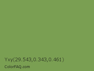 Yxy 29.543,0.343,0.461 Color is a normal green color and the nearest color is Asparagus Green #7ba05b. Hex code #7a9f52 and RGB value is rgb(122,159,82). In RGB color space, this color is composed of 48% red, 62% green, 32% blue, In CMYK color space, this color is composed of 23% cyan, 0% magenta, 48% yellow , 38% black , In HSL color space, this color has a hue angle of 89° , 32% saturation and 47% lightness.