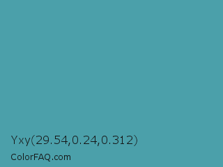 Yxy 29.54,0.24,0.312 Color is a normal cyan color and the nearest color is Hippie Blue #589aaf. Hex code #4ba0aa and RGB value is rgb(75,160,170). In RGB color space, this color is composed of 29% red, 63% green, 67% blue, In CMYK color space, this color is composed of 56% cyan, 6% magenta, 0% yellow , 33% black , In HSL color space, this color has a hue angle of 186° , 39% saturation and 48% lightness.