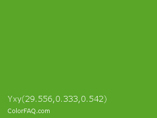 Yxy 29.556,0.333,0.542 Color is a normal green color and the nearest color is Green RYB #66b032. Hex code #59a629 and RGB value is rgb(89,166,41). In RGB color space, this color is composed of 35% red, 65% green, 16% blue, In CMYK color space, this color is composed of 46% cyan, 0% magenta, 75% yellow , 35% black , In HSL color space, this color has a hue angle of 97° , 60% saturation and 41% lightness.
