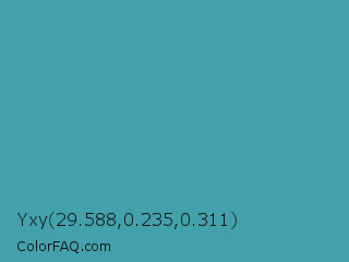 Yxy 29.588,0.235,0.311 Color is a normal cyan color and the nearest color is Verdigris #43b3ae. Hex code #42a1ab and RGB value is rgb(66,161,171). In RGB color space, this color is composed of 26% red, 63% green, 67% blue, In CMYK color space, this color is composed of 61% cyan, 6% magenta, 0% yellow , 33% black , In HSL color space, this color has a hue angle of 186° , 44% saturation and 46% lightness.