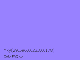 Yxy 29.596,0.233,0.178 Color is a light indigo color and the nearest color is Portage #8b9fee. Hex code #9881ff and RGB value is rgb(152,129,255). In RGB color space, this color is composed of 60% red, 51% green, 100% blue, In CMYK color space, this color is composed of 40% cyan, 49% magenta, 0% yellow , 0% black , In HSL color space, this color has a hue angle of 251° , 100% saturation and 75% lightness.