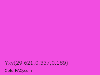 Yxy 29.621,0.337,0.189 Color is a light magenta color and the nearest color is Purple Pizzazz #fe4eda. Hex code #f24de1 and RGB value is rgb(242,77,225). In RGB color space, this color is composed of 95% red, 30% green, 88% blue, In CMYK color space, this color is composed of 0% cyan, 68% magenta, 7% yellow , 5% black , In HSL color space, this color has a hue angle of 306° , 86% saturation and 63% lightness.