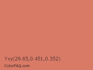 Yxy 29.65,0.451,0.352 Color is a light red color and the nearest color is Japonica #d87c63. Hex code #d97a67 and RGB value is rgb(217,122,103). In RGB color space, this color is composed of 85% red, 48% green, 40% blue, In CMYK color space, this color is composed of 0% cyan, 44% magenta, 53% yellow , 15% black , In HSL color space, this color has a hue angle of 10° , 60% saturation and 63% lightness.