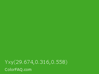 Yxy 29.674,0.316,0.558 Color is a normal green color and the nearest color is Wageningen Green #34b233. Hex code #42a926 and RGB value is rgb(66,169,38). In RGB color space, this color is composed of 26% red, 66% green, 15% blue, In CMYK color space, this color is composed of 61% cyan, 0% magenta, 78% yellow , 34% black , In HSL color space, this color has a hue angle of 107° , 63% saturation and 41% lightness.