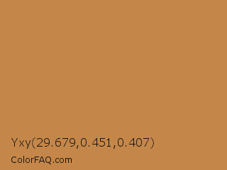 Yxy 29.679,0.451,0.407 Color is a normal orange color and the nearest color is Peru #cd853f. Hex code #c58749 and RGB value is rgb(197,135,73). In RGB color space, this color is composed of 77% red, 53% green, 29% blue, In CMYK color space, this color is composed of 0% cyan, 31% magenta, 63% yellow , 23% black , In HSL color space, this color has a hue angle of 30° , 52% saturation and 53% lightness.