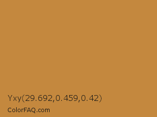 Yxy 29.692,0.459,0.42 Color is a normal orange color and the nearest color is Peru #cd853f. Hex code #c4883e and RGB value is rgb(196,136,62). In RGB color space, this color is composed of 77% red, 53% green, 24% blue, In CMYK color space, this color is composed of 0% cyan, 31% magenta, 68% yellow , 23% black , In HSL color space, this color has a hue angle of 33° , 53% saturation and 51% lightness.