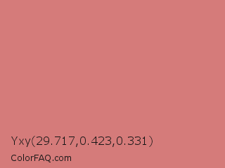 Yxy 29.717,0.423,0.331 Color is a light red color and the nearest color is New York Pink #d7837f. Hex code #d57b7a and RGB value is rgb(213,123,122). In RGB color space, this color is composed of 84% red, 48% green, 48% blue, In CMYK color space, this color is composed of 0% cyan, 42% magenta, 43% yellow , 16% black , In HSL color space, this color has a hue angle of 1° , 52% saturation and 66% lightness.