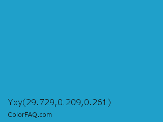 Yxy 29.729,0.209,0.261 Color is a normal blue color and the nearest color is Pacific Blue #1ca9c9. Hex code #1fa0ca and RGB value is rgb(31,160,202). In RGB color space, this color is composed of 12% red, 63% green, 79% blue, In CMYK color space, this color is composed of 85% cyan, 21% magenta, 0% yellow , 21% black , In HSL color space, this color has a hue angle of 195° , 73% saturation and 46% lightness.