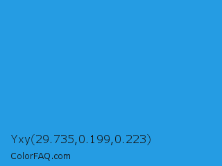 Yxy 29.735,0.199,0.223 Color is a normal blue color and the nearest color is Button Blue #24a0ed. Hex code #259ce3 and RGB value is rgb(37,156,227). In RGB color space, this color is composed of 15% red, 61% green, 89% blue, In CMYK color space, this color is composed of 84% cyan, 31% magenta, 0% yellow , 11% black , In HSL color space, this color has a hue angle of 202° , 77% saturation and 52% lightness.