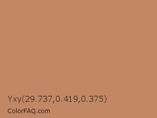 Yxy 29.737,0.419,0.375 Color is a normal orange color and the nearest color is Antique Brass #c88a65. Hex code #c28765 and RGB value is rgb(194,135,101). In RGB color space, this color is composed of 76% red, 53% green, 40% blue, In CMYK color space, this color is composed of 0% cyan, 30% magenta, 48% yellow , 24% black , In HSL color space, this color has a hue angle of 22° , 43% saturation and 58% lightness.