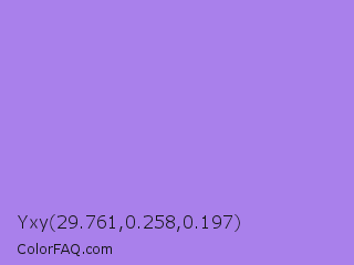 Yxy 29.761,0.258,0.197 Color is a light violet color and the nearest color is Lavender #b57edc. Hex code #a980eb and RGB value is rgb(169,128,235). In RGB color space, this color is composed of 66% red, 50% green, 92% blue, In CMYK color space, this color is composed of 28% cyan, 46% magenta, 0% yellow , 8% black , In HSL color space, this color has a hue angle of 263° , 73% saturation and 71% lightness.