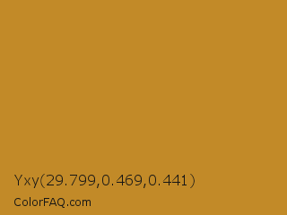 Yxy 29.799,0.469,0.441 Color is a normal orange color and the nearest color is Marigold #b98d28. Hex code #c28a28 and RGB value is rgb(194,138,40). In RGB color space, this color is composed of 76% red, 54% green, 16% blue, In CMYK color space, this color is composed of 0% cyan, 29% magenta, 79% yellow , 24% black , In HSL color space, this color has a hue angle of 38° , 66% saturation and 46% lightness.