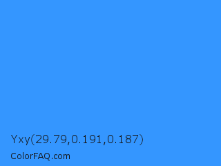 Yxy 29.79,0.191,0.187 Color is a normal blue color and the nearest color is Brilliant Azure #3399ff. Hex code #3496ff and RGB value is rgb(52,150,255). In RGB color space, this color is composed of 20% red, 59% green, 100% blue, In CMYK color space, this color is composed of 80% cyan, 41% magenta, 0% yellow , 0% black , In HSL color space, this color has a hue angle of 211° , 100% saturation and 60% lightness.