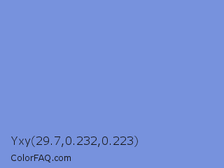 Yxy 29.7,0.232,0.223 Color is a light blue color and the nearest color is Vista Blue #7c9ed9. Hex code #7792dd and RGB value is rgb(119,146,221). In RGB color space, this color is composed of 47% red, 57% green, 87% blue, In CMYK color space, this color is composed of 46% cyan, 34% magenta, 0% yellow , 13% black , In HSL color space, this color has a hue angle of 224° , 60% saturation and 67% lightness.