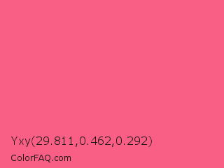 Yxy 29.811,0.462,0.292 Color is a light red color and the nearest color is Brink Pink #fb607f. Hex code #f95e84 and RGB value is rgb(249,94,132). In RGB color space, this color is composed of 98% red, 37% green, 52% blue, In CMYK color space, this color is composed of 0% cyan, 62% magenta, 47% yellow , 2% black , In HSL color space, this color has a hue angle of 345° , 93% saturation and 67% lightness.