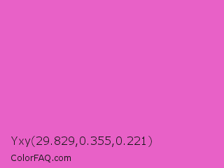 Yxy 29.829,0.355,0.221 Color is a light magenta color and the nearest color is Rose Pink #ff66cc. Hex code #e861c7 and RGB value is rgb(232,97,199). In RGB color space, this color is composed of 91% red, 38% green, 78% blue, In CMYK color space, this color is composed of 0% cyan, 58% magenta, 14% yellow , 9% black , In HSL color space, this color has a hue angle of 315° , 75% saturation and 65% lightness.