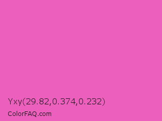 Yxy 29.82,0.374,0.232 Color is a light magenta color and the nearest color is Hot Pink #ff69b4. Hex code #ed5fbc and RGB value is rgb(237,95,188). In RGB color space, this color is composed of 93% red, 37% green, 74% blue, In CMYK color space, this color is composed of 0% cyan, 60% magenta, 21% yellow , 7% black , In HSL color space, this color has a hue angle of 321° , 80% saturation and 65% lightness.