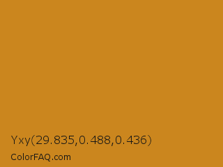 Yxy 29.835,0.488,0.436 Color is a normal orange color and the nearest color is Geebung #d18f1b. Hex code #cb861e and RGB value is rgb(203,134,30). In RGB color space, this color is composed of 80% red, 53% green, 12% blue, In CMYK color space, this color is composed of 0% cyan, 34% magenta, 85% yellow , 20% black , In HSL color space, this color has a hue angle of 36° , 74% saturation and 46% lightness.