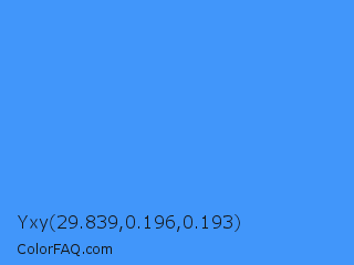 Yxy 29.839,0.196,0.193 Color is a light blue color and the nearest color is Brilliant Azure #3399ff. Hex code #4196fa and RGB value is rgb(65,150,250). In RGB color space, this color is composed of 25% red, 59% green, 98% blue, In CMYK color space, this color is composed of 74% cyan, 40% magenta, 0% yellow , 2% black , In HSL color space, this color has a hue angle of 212° , 95% saturation and 62% lightness.