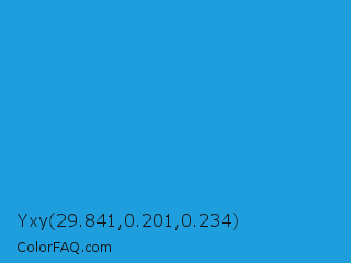 Yxy 29.841,0.201,0.234 Color is a normal blue color and the nearest color is Battery Charged Blue #1dacd6. Hex code #1e9edc and RGB value is rgb(30,158,220). In RGB color space, this color is composed of 12% red, 62% green, 86% blue, In CMYK color space, this color is composed of 86% cyan, 28% magenta, 0% yellow , 14% black , In HSL color space, this color has a hue angle of 200° , 76% saturation and 49% lightness.