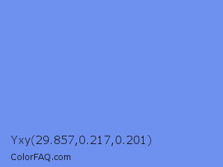 Yxy 29.857,0.217,0.201 Color is a light blue color and the nearest color is Cornflower Blue #6495ed. Hex code #6e91f0 and RGB value is rgb(110,145,240). In RGB color space, this color is composed of 43% red, 57% green, 94% blue, In CMYK color space, this color is composed of 54% cyan, 40% magenta, 0% yellow , 6% black , In HSL color space, this color has a hue angle of 224° , 81% saturation and 69% lightness.