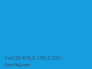Yxy 29.876,0.199,0.231 Color is a normal blue color and the nearest color is Battery Charged Blue #1dacd6. Hex code #159ede and RGB value is rgb(21,158,222). In RGB color space, this color is composed of 8% red, 62% green, 87% blue, In CMYK color space, this color is composed of 91% cyan, 29% magenta, 0% yellow , 13% black , In HSL color space, this color has a hue angle of 199° , 83% saturation and 48% lightness.