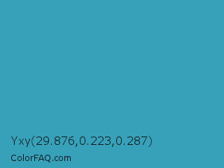 Yxy 29.876,0.223,0.287 Color is a normal cyan color and the nearest color is Pelorous #3eabbf. Hex code #37a1ba and RGB value is rgb(55,161,186). In RGB color space, this color is composed of 22% red, 63% green, 73% blue, In CMYK color space, this color is composed of 70% cyan, 13% magenta, 0% yellow , 27% black , In HSL color space, this color has a hue angle of 191° , 54% saturation and 47% lightness.