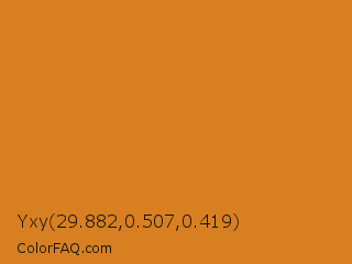 Yxy 29.882,0.507,0.419 Color is a normal orange color and the nearest color is Ochre #cc7722. Hex code #d87f21 and RGB value is rgb(216,127,33). In RGB color space, this color is composed of 85% red, 50% green, 13% blue, In CMYK color space, this color is composed of 0% cyan, 41% magenta, 85% yellow , 15% black , In HSL color space, this color has a hue angle of 31° , 73% saturation and 49% lightness.