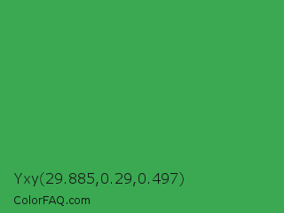 Yxy 29.885,0.29,0.497 Color is a normal green color and the nearest color is Chateau Green #40a860. Hex code #3aa952 and RGB value is rgb(58,169,82). In RGB color space, this color is composed of 23% red, 66% green, 32% blue, In CMYK color space, this color is composed of 66% cyan, 0% magenta, 51% yellow , 34% black , In HSL color space, this color has a hue angle of 133° , 49% saturation and 45% lightness.