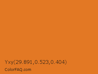 Yxy 29.891,0.523,0.404 Color is a normal orange color and the nearest color is Tango #ed7a1c. Hex code #e37824 and RGB value is rgb(227,120,36). In RGB color space, this color is composed of 89% red, 47% green, 14% blue, In CMYK color space, this color is composed of 0% cyan, 47% magenta, 84% yellow , 11% black , In HSL color space, this color has a hue angle of 26° , 77% saturation and 52% lightness.