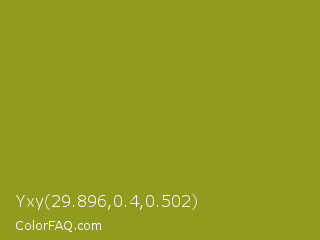 Yxy 29.896,0.4,0.502 Color is a normal yellow color and the nearest color is Citron #9fa91f. Hex code #919c1f and RGB value is rgb(145,156,31). In RGB color space, this color is composed of 57% red, 61% green, 12% blue, In CMYK color space, this color is composed of 7% cyan, 0% magenta, 80% yellow , 39% black , In HSL color space, this color has a hue angle of 65° , 67% saturation and 37% lightness.