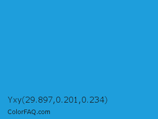 Yxy 29.897,0.201,0.234 Color is a normal blue color and the nearest color is Battery Charged Blue #1dacd6. Hex code #1e9edc and RGB value is rgb(30,158,220). In RGB color space, this color is composed of 12% red, 62% green, 86% blue, In CMYK color space, this color is composed of 86% cyan, 28% magenta, 0% yellow , 14% black , In HSL color space, this color has a hue angle of 200° , 76% saturation and 49% lightness.