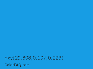 Yxy 29.898,0.197,0.223 Color is a normal blue color and the nearest color is Button Blue #24a0ed. Hex code #179de4 and RGB value is rgb(23,157,228). In RGB color space, this color is composed of 9% red, 62% green, 89% blue, In CMYK color space, this color is composed of 90% cyan, 31% magenta, 0% yellow , 11% black , In HSL color space, this color has a hue angle of 201° , 82% saturation and 49% lightness.