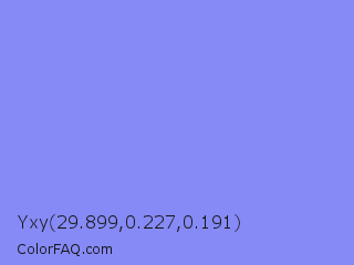 Yxy 29.899,0.227,0.191 Color is a light blue color and the nearest color is Portage #8b9fee. Hex code #868af6 and RGB value is rgb(134,138,246). In RGB color space, this color is composed of 53% red, 54% green, 96% blue, In CMYK color space, this color is composed of 46% cyan, 44% magenta, 0% yellow , 4% black , In HSL color space, this color has a hue angle of 238° , 86% saturation and 75% lightness.