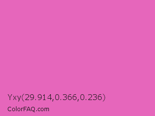 Yxy 29.914,0.366,0.236 Color is a light magenta color and the nearest color is Hot Pink #ff69b4. Hex code #e666bb and RGB value is rgb(230,102,187). In RGB color space, this color is composed of 90% red, 40% green, 73% blue, In CMYK color space, this color is composed of 0% cyan, 56% magenta, 19% yellow , 10% black , In HSL color space, this color has a hue angle of 320° , 72% saturation and 65% lightness.