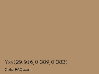Yxy 29.916,0.389,0.383 Color is a normal orange color and the nearest color is Light Taupe #b38b6d. Hex code #b08f6a and RGB value is rgb(176,143,106). In RGB color space, this color is composed of 69% red, 56% green, 42% blue, In CMYK color space, this color is composed of 0% cyan, 19% magenta, 40% yellow , 31% black , In HSL color space, this color has a hue angle of 32° , 31% saturation and 55% lightness.