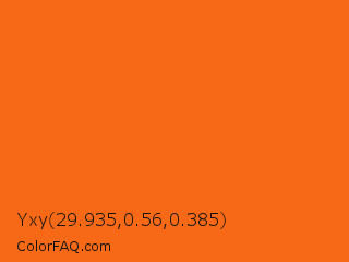 Yxy 29.935,0.56,0.385 Color is a normal orange color and the nearest color is Orange #ff681f. Hex code #f76917 and RGB value is rgb(247,105,23). In RGB color space, this color is composed of 97% red, 41% green, 9% blue, In CMYK color space, this color is composed of 0% cyan, 57% magenta, 91% yellow , 3% black , In HSL color space, this color has a hue angle of 22° , 93% saturation and 53% lightness.