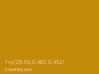 Yxy 29.93,0.482,0.452 Color is a normal orange color and the nearest color is Dark Goldenrod #b8860b. Hex code #c48a0a and RGB value is rgb(196,138,10). In RGB color space, this color is composed of 77% red, 54% green, 4% blue, In CMYK color space, this color is composed of 0% cyan, 30% magenta, 95% yellow , 23% black , In HSL color space, this color has a hue angle of 41° , 90% saturation and 40% lightness.