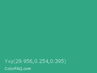 Yxy 29.956,0.254,0.395 Color is a normal green color and the nearest color is Jungle Green #29ab87. Hex code #31a784 and RGB value is rgb(49,167,132). In RGB color space, this color is composed of 19% red, 65% green, 52% blue, In CMYK color space, this color is composed of 71% cyan, 0% magenta, 21% yellow , 35% black , In HSL color space, this color has a hue angle of 162° , 55% saturation and 42% lightness.