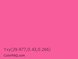 Yxy 29.977,0.43,0.266 Color is a light rose color and the nearest color is Violet Red #f75394. Hex code #f85c9b and RGB value is rgb(248,92,155). In RGB color space, this color is composed of 97% red, 36% green, 61% blue, In CMYK color space, this color is composed of 0% cyan, 63% magenta, 38% yellow , 3% black , In HSL color space, this color has a hue angle of 336° , 92% saturation and 67% lightness.