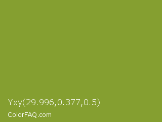 Yxy 29.996,0.377,0.5 Color is a normal lime color and the nearest color is Sushi #87ab39. Hex code #859f30 and RGB value is rgb(133,159,48). In RGB color space, this color is composed of 52% red, 62% green, 19% blue, In CMYK color space, this color is composed of 16% cyan, 0% magenta, 70% yellow , 38% black , In HSL color space, this color has a hue angle of 74° , 54% saturation and 41% lightness.
