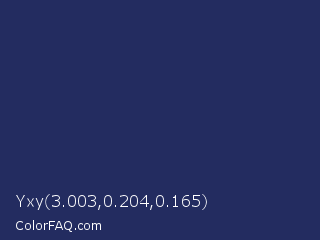 Yxy 3.003,0.204,0.165 Color is a dark blue color and the nearest color is Biscay #1b3162. Hex code #232c60 and RGB value is rgb(35,44,96). In RGB color space, this color is composed of 14% red, 17% green, 38% blue, In CMYK color space, this color is composed of 64% cyan, 54% magenta, 0% yellow , 62% black , In HSL color space, this color has a hue angle of 231° , 47% saturation and 26% lightness.