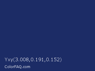 Yxy 3.008,0.191,0.152 Color is a dark blue color and the nearest color is Biscay #1b3162. Hex code #1c2c66 and RGB value is rgb(28,44,102). In RGB color space, this color is composed of 11% red, 17% green, 40% blue, In CMYK color space, this color is composed of 73% cyan, 57% magenta, 0% yellow , 60% black , In HSL color space, this color has a hue angle of 227° , 57% saturation and 25% lightness.