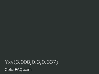 Yxy 3.008,0.3,0.337 Color is a very dark green color and the nearest color is Mine Shaft #323232. Hex code #2b3230 and RGB value is rgb(43,50,48). In RGB color space, this color is composed of 17% red, 20% green, 19% blue, In CMYK color space, this color is composed of 14% cyan, 0% magenta, 4% yellow , 80% black , In HSL color space, this color has a hue angle of 163° , 8% saturation and 18% lightness.