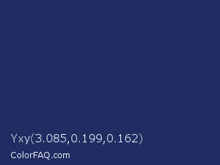 Yxy 3.085,0.199,0.162 Color is a dark blue color and the nearest color is Biscay #1b3162. Hex code #202d63 and RGB value is rgb(32,45,99). In RGB color space, this color is composed of 13% red, 18% green, 39% blue, In CMYK color space, this color is composed of 68% cyan, 55% magenta, 0% yellow , 61% black , In HSL color space, this color has a hue angle of 228° , 51% saturation and 26% lightness.