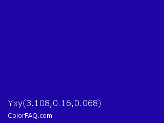 Yxy 3.108,0.16,0.068 Color is a normal indigo color and the nearest color is Ultramarine #120a8f. Hex code #1e07a4 and RGB value is rgb(30,7,164). In RGB color space, this color is composed of 12% red, 3% green, 64% blue, In CMYK color space, this color is composed of 82% cyan, 96% magenta, 0% yellow , 36% black , In HSL color space, this color has a hue angle of 249° , 92% saturation and 34% lightness.