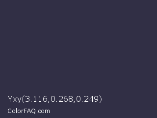 Yxy 3.116,0.268,0.249 Color is a dark indigo color and the nearest color is Tuna #353542. Hex code #312f45 and RGB value is rgb(49,47,69). In RGB color space, this color is composed of 19% red, 18% green, 27% blue, In CMYK color space, this color is composed of 29% cyan, 32% magenta, 0% yellow , 73% black , In HSL color space, this color has a hue angle of 245° , 19% saturation and 23% lightness.